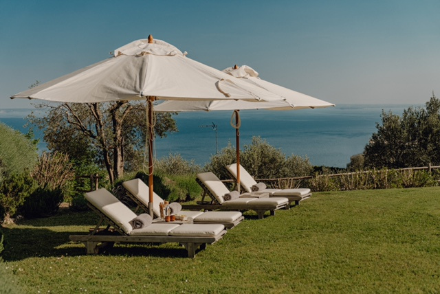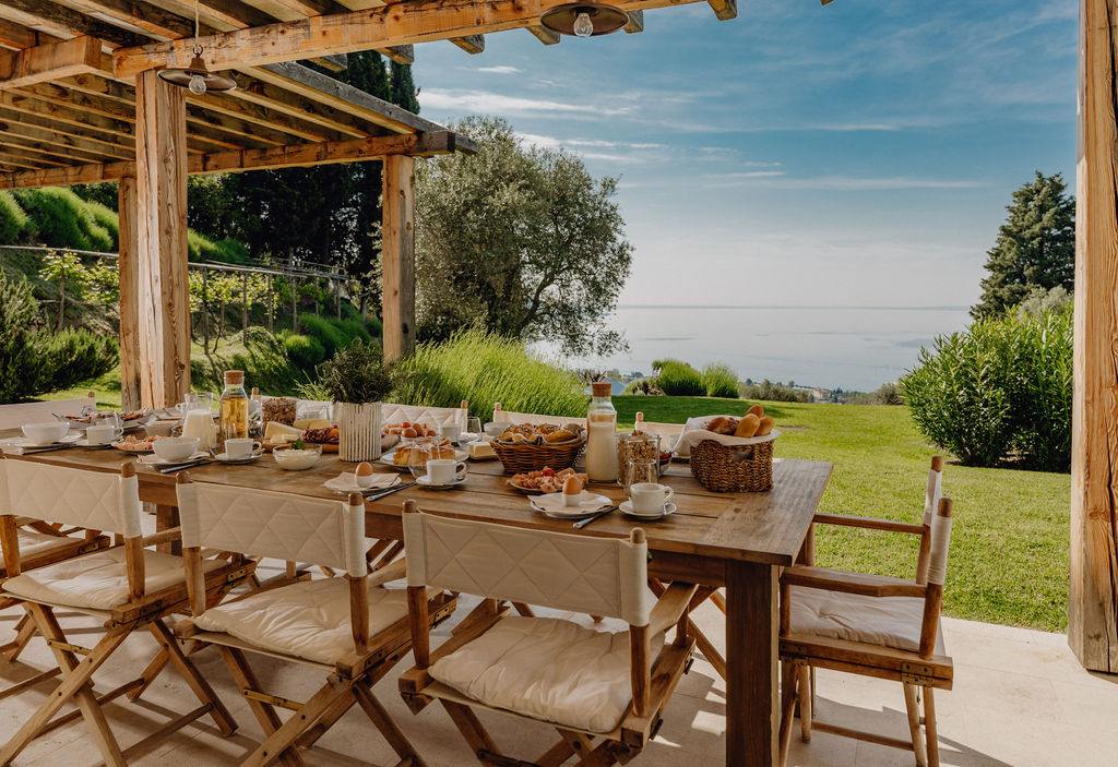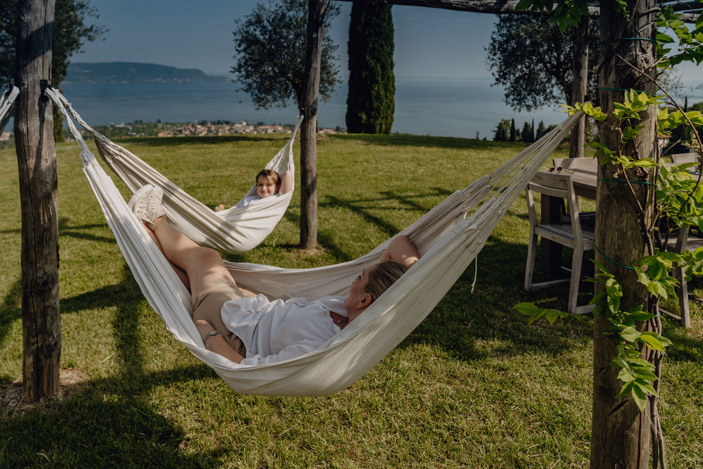 – Dining and relax area in the olive grove overlooking the lake, with swinging hammocks and a dining table –